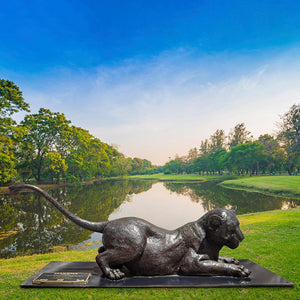 Description This captivating bronze sculpture depicting the serene repose of an endangered giraffe atop a bed of golden flowers. The graceful contours of the giraffe's form are meticulously rendered, from its arched neck to its slender legs. Resting on a single golden blossom, the giraffe symbolizes both fragility and resilience, urging viewers to reflect on the importance of protecting our planet's biodiversity. Surrounding foliage adds depth to the composition, emphasizing the beauty of nature and the urgency of conservation efforts.
