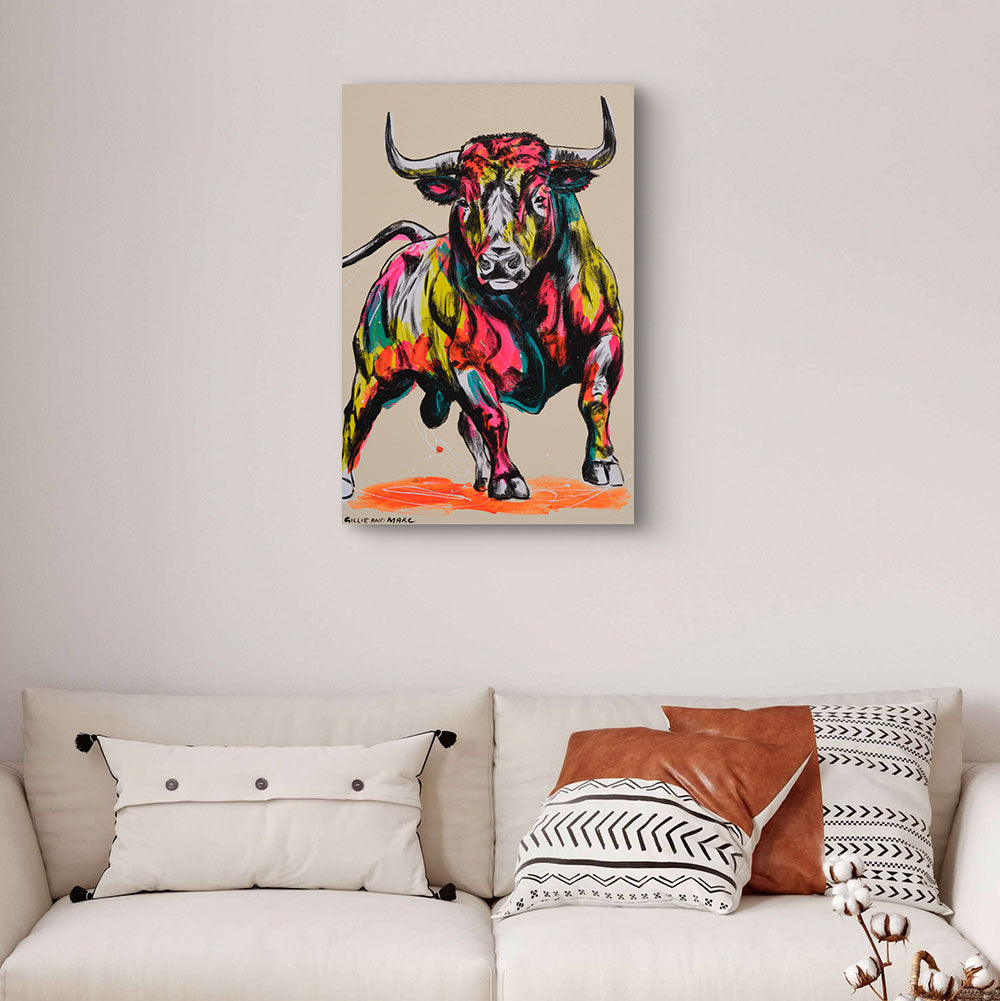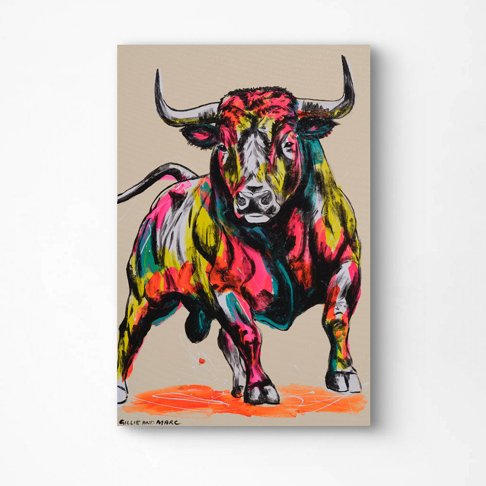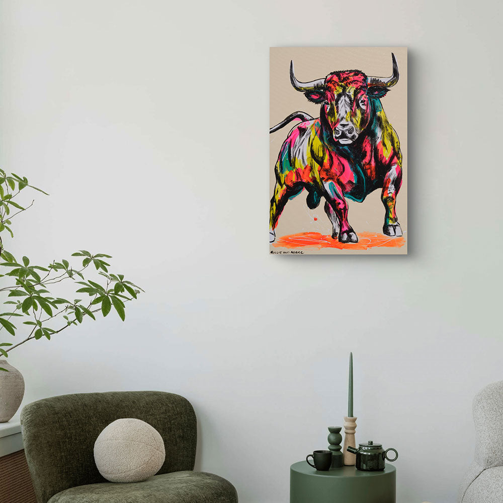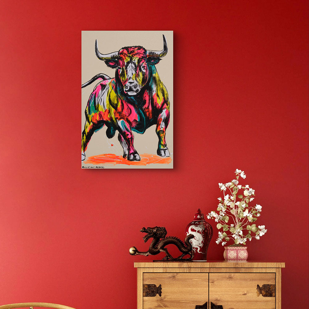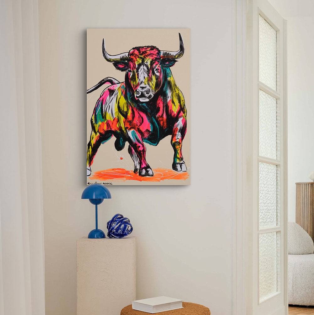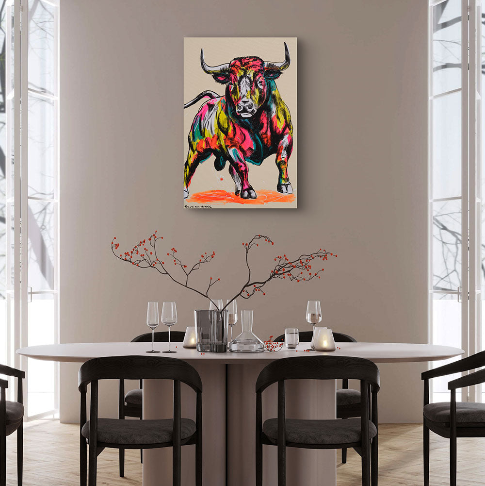 This powerful and vibrant painting captures the bold energy of a bull in motion, charging forward with fierce determination. The bull’s form is brought to life with dynamic, sweeping brushstrokes and vivid colors—bright pinks, yellows, and blues—contrasting against the soft beige background. The bold, expressive use of color conveys the animal’s strength, agility, and raw power, while the energetic composition adds a sense of urgency and excitement. This artwork celebrates the spirit of resilience and vitality, portraying the bull as a force to be reckoned with.