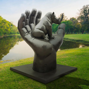 This striking bronze sculpture depicts an endangered rhino delicately cradled within an oversized human hand, creating a poignant visual metaphor for the fragile balance between humanity and nature. The rhino, rendered with intricate detail, symbolizes the vulnerability of wildlife in the face of environmental threats, while the outstretched hand embodies our collective responsibility to protect these magnificent creatures and their habitats. The use of bronze not only highlights the permanence of the message but also reflects the enduring spirit of both the rhino and the natural world, urging viewers to acknowledge their role in conservation efforts. Together, these elements invoke a sense of empathy and a call to action, reminding us that the survival of such majestic beings rests in our hands.