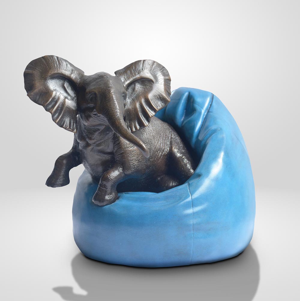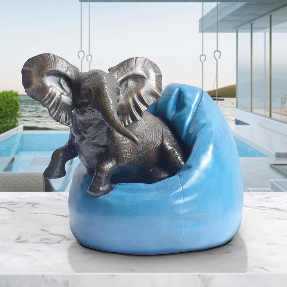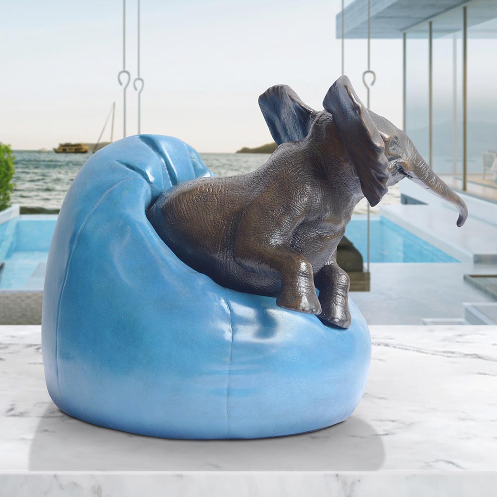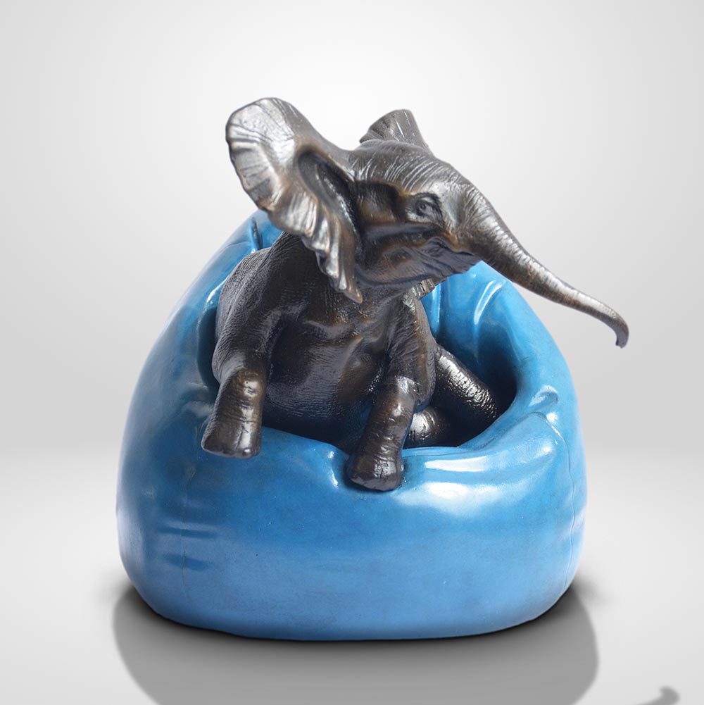 This captivating bronze sculpture depicts a baby elephant comfortably nestled in a plush beanbag, perfectly molded to fit its small stature. The artwork beautifully highlights the delicate features of the endangered elephant, capturing its innocence and playful spirit. The juxtaposition of the elephant with the cozy beanbag symbolizes the need for protection and care in a world that often overlooks the fragility of wildlife. It serves as a poignant reminder of the importance of nurturing and preserving these gentle giants, urging viewers to reflect on their role in ensuring the survival of endangered species. This enchanting piece inspires compassion and awareness, inviting us to consider the comfort and safety that should be afforded to all living beings, especially those at risk.