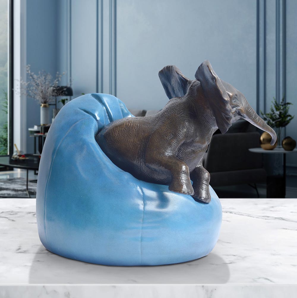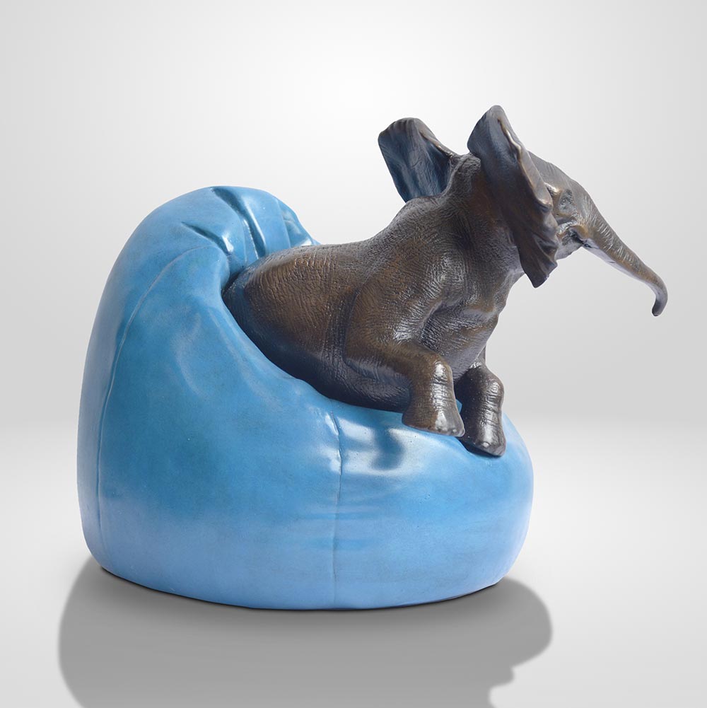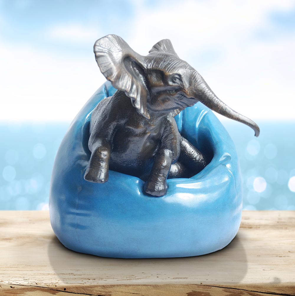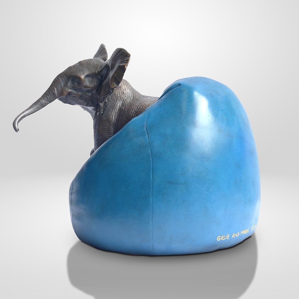 This captivating bronze sculpture depicts a baby elephant comfortably nestled in a plush beanbag, perfectly molded to fit its small stature. The artwork beautifully highlights the delicate features of the endangered elephant, capturing its innocence and playful spirit. The juxtaposition of the elephant with the cozy beanbag symbolizes the need for protection and care in a world that often overlooks the fragility of wildlife. It serves as a poignant reminder of the importance of nurturing and preserving these gentle giants, urging viewers to reflect on their role in ensuring the survival of endangered species. This enchanting piece inspires compassion and awareness, inviting us to consider the comfort and safety that should be afforded to all living beings, especially those at risk.