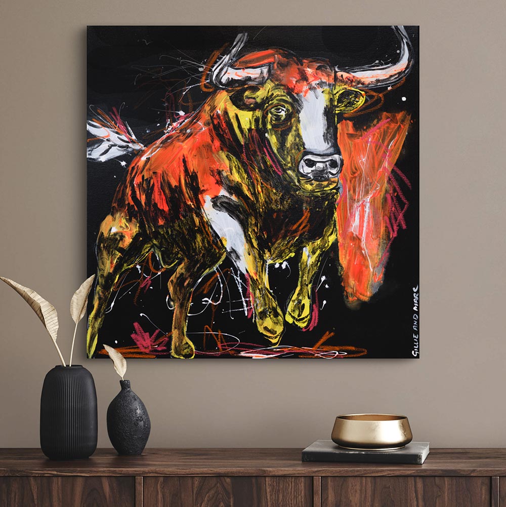 This dynamic artwork, titled "Bull of Courage," vividly portrays the sheer strength and indomitable spirit of a bull in an expressive, abstract style. The bold interplay of colors—fiery reds, oranges, and bright yellows—against a dark background symbolizes bravery, determination, and unwavering resolve. The bull’s fierce expression and powerful stance evoke a sense of raw energy and courage, challenging viewers to confront their fears head-on. Each brushstroke is filled with intensity and movement, capturing the essence of the bull in a way that is both mesmerizing and empowering. "Bull of Courage" serves as a powerful reminder that true bravery is about standing strong in the face of adversity.