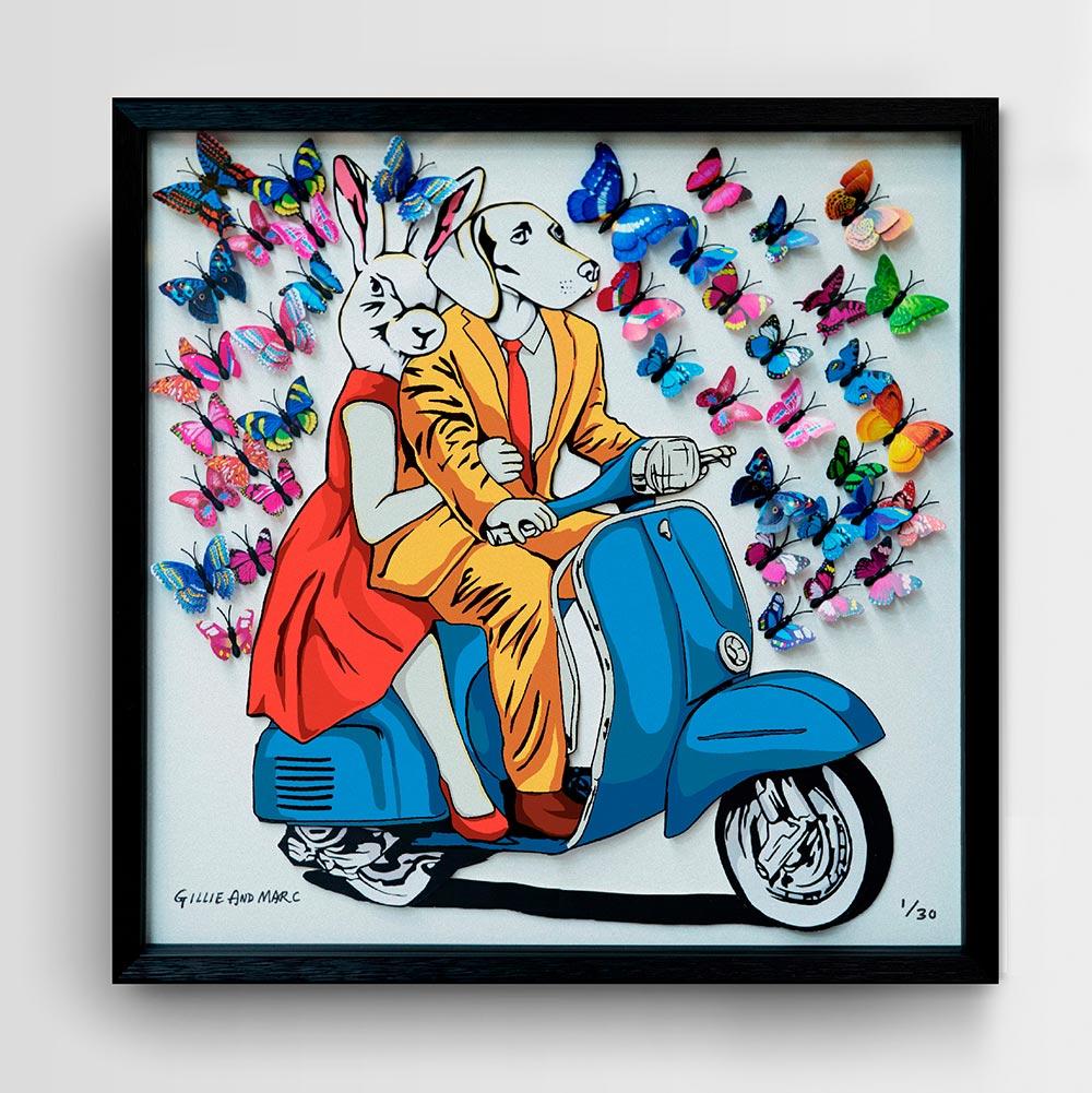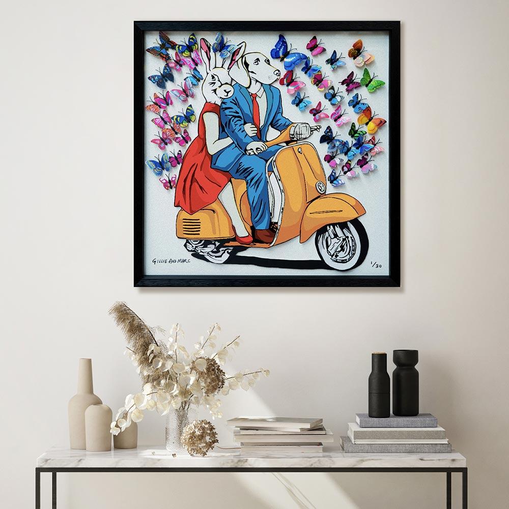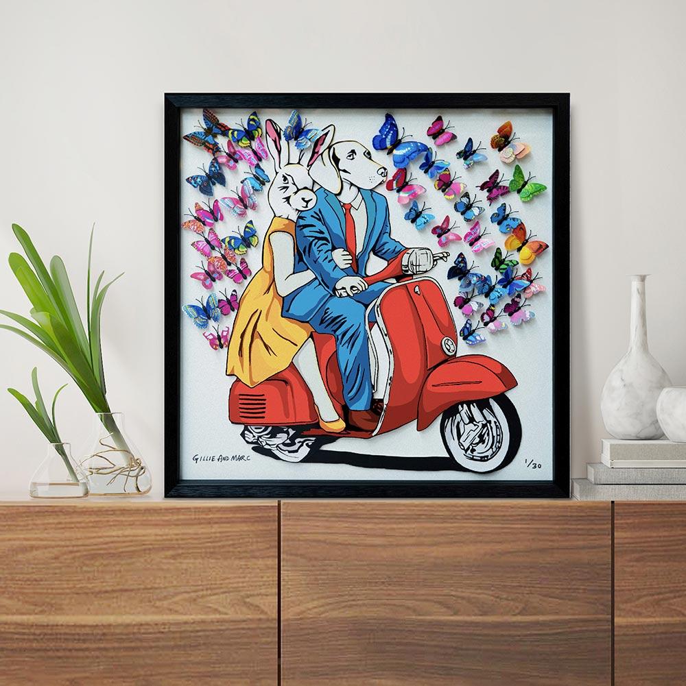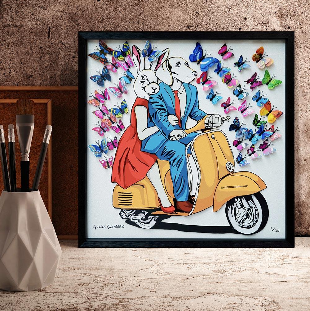 Ride away with Rabbitwoman and Dogman to a world without judgement, featuring their favourite mode of transportation! The Vespa reminds you not to worry so much about the destination, because life is about enjoying the ride! Surrounded by beautiful butterflies, they represent love and happiness.