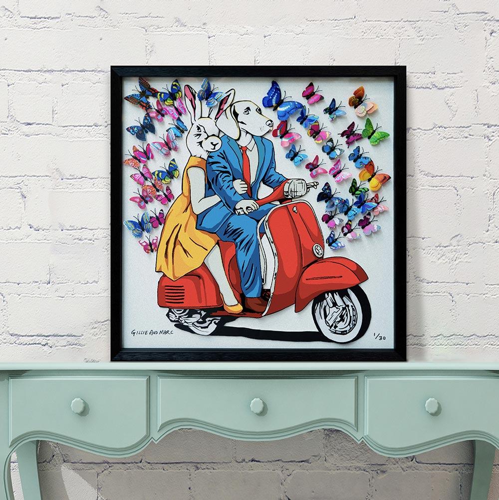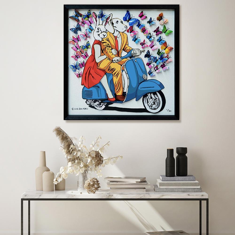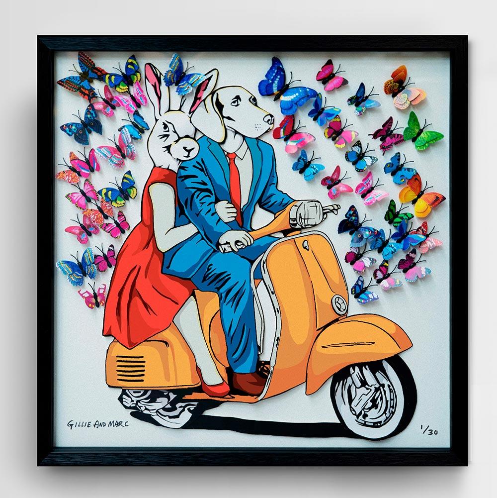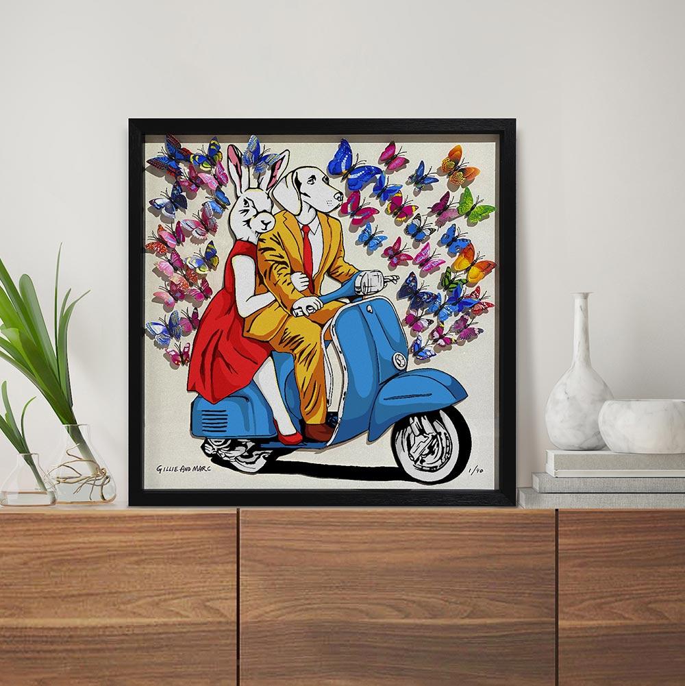 Ride away with Rabbitwoman and Dogman to a world without judgement, featuring their favourite mode of transportation! The Vespa reminds you not to worry so much about the destination, because life is about enjoying the ride! Surrounded by beautiful butterflies, they represent love and happiness.