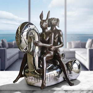 Expertly crafted in everlasting bronze and mirror stainless steel, Rabbitwoman and Dogman, Gillie and Marc’s most iconic hybrid characters, are off on a brand-new adventure, setting sail on an inflatable flamingo! The flamingo is the perfect accessory for any trip to the water, exuding the ideas of fun in the sun and a time to enjoy and play.