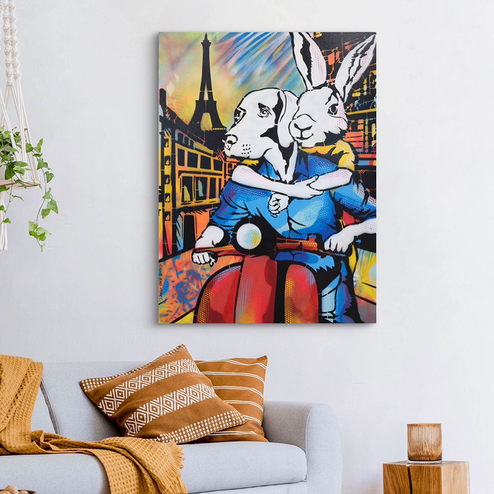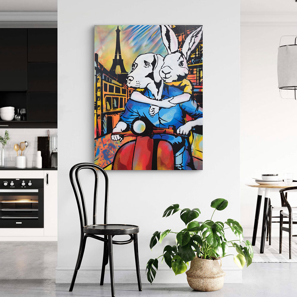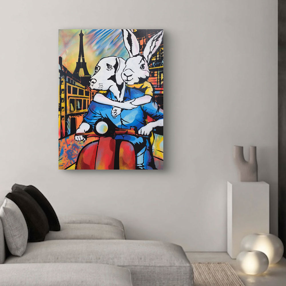 It Was a Holiday in Paris showcases Rabbitwoman and Dogman on a red scooter, journeying through the enchanting streets of Paris with the Eiffel Tower standing tall in the background. The scene is alive with bright colors and dynamic patterns that evoke the excitement of exploring a new place. Rabbitwoman’s affectionate embrace of Dogman captures the warmth and closeness of the holiday spirit. The artwork exudes joy, freedom, and adventure, celebrating the magic of discovering Paris together. This piece is a tribute to the unforgettable memories made while traveling with a loved one.