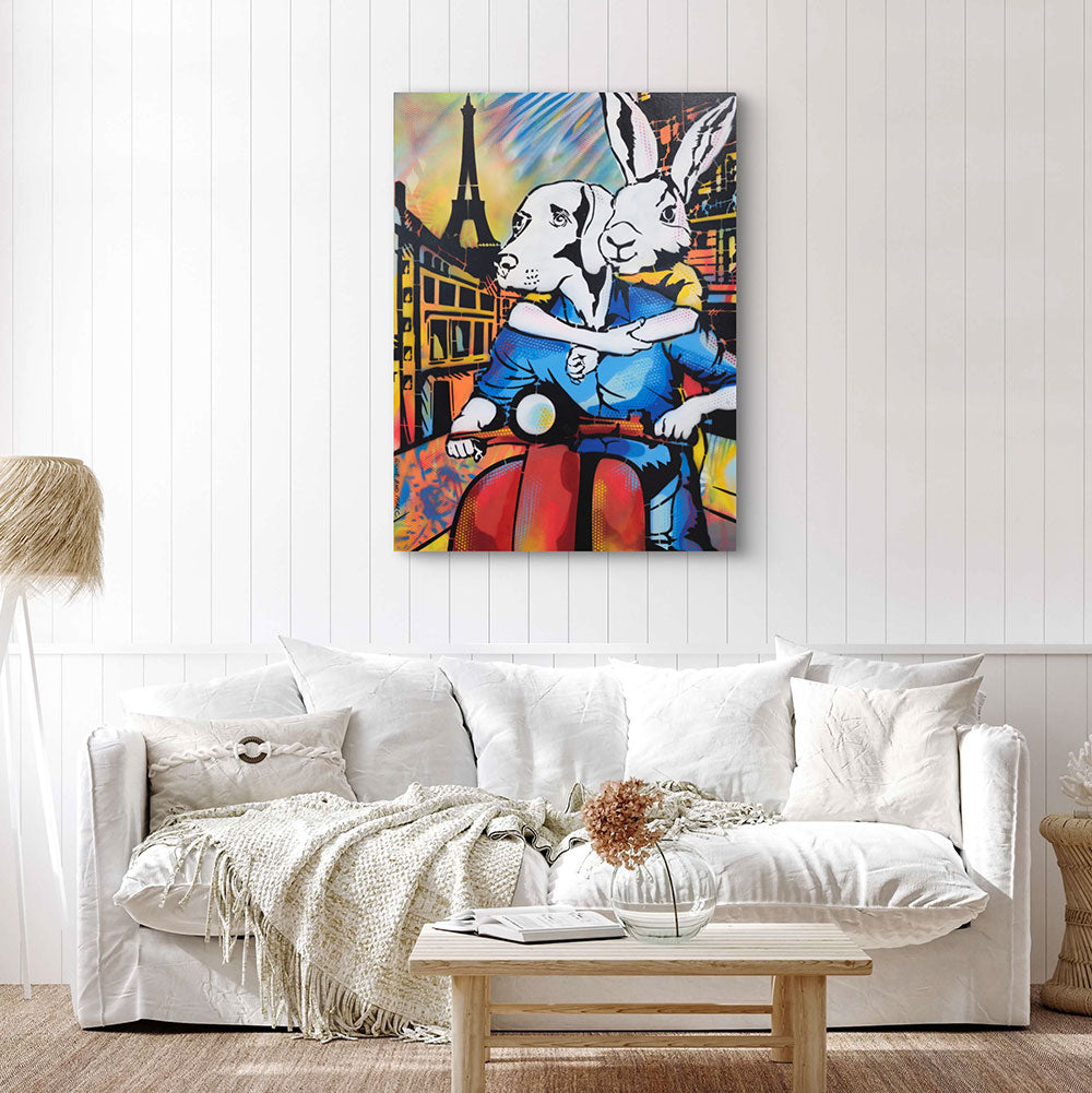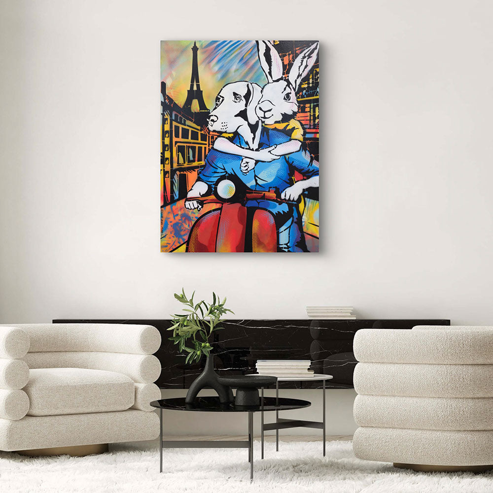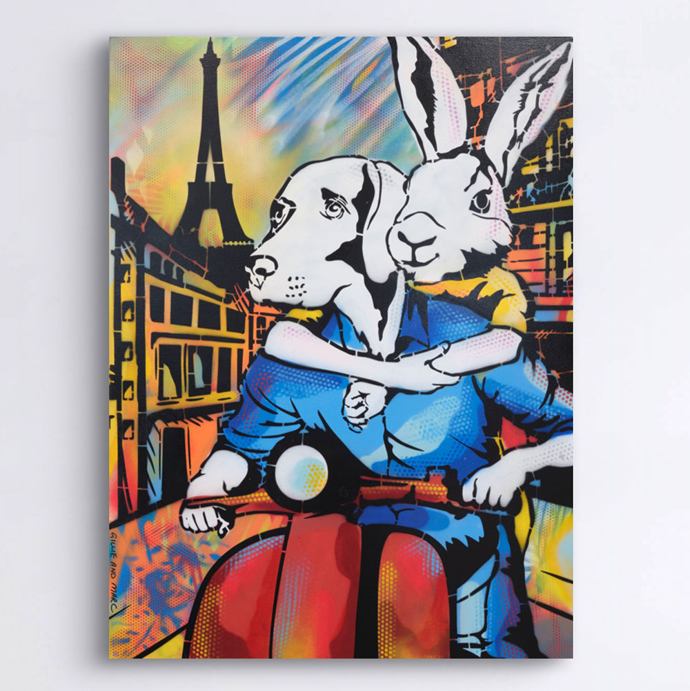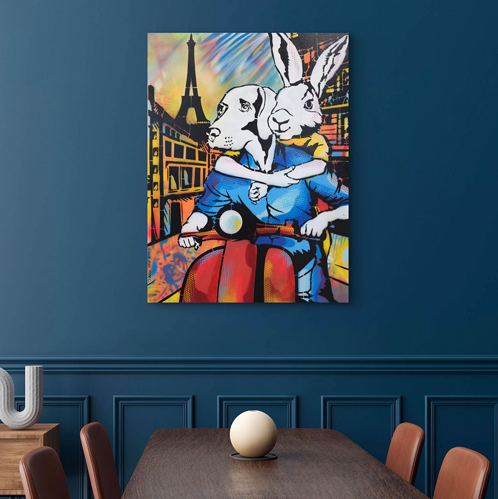 It Was a Holiday in Paris showcases Rabbitwoman and Dogman on a red scooter, journeying through the enchanting streets of Paris with the Eiffel Tower standing tall in the background. The scene is alive with bright colors and dynamic patterns that evoke the excitement of exploring a new place. Rabbitwoman’s affectionate embrace of Dogman captures the warmth and closeness of the holiday spirit. The artwork exudes joy, freedom, and adventure, celebrating the magic of discovering Paris together. This piece is a tribute to the unforgettable memories made while traveling with a loved one.