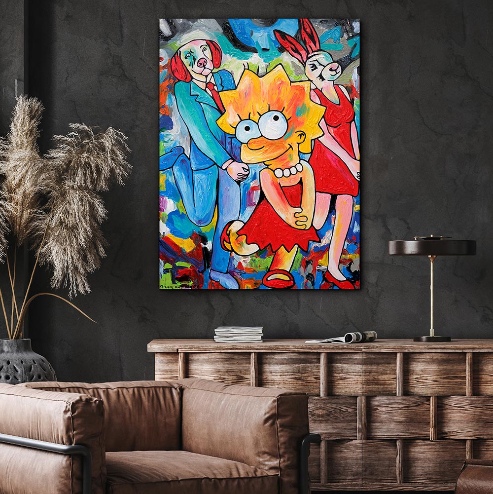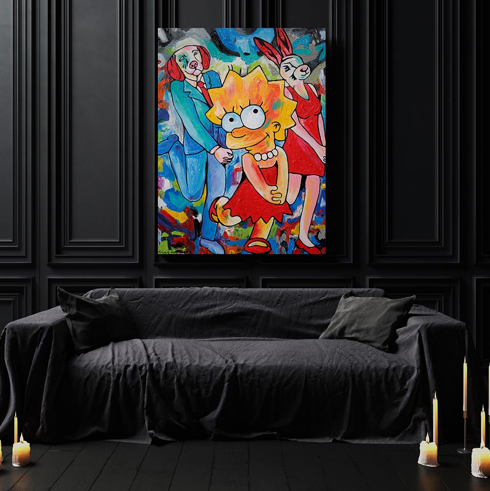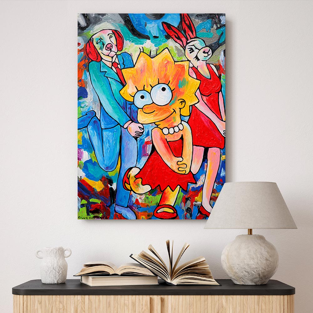 "Lisa Oh Lisa," a mesmerizing scene unfolds as Lisa takes center stage, gracefully dancing amidst a vibrant backdrop filled with the whimsical presence of Dogman and Rabbitwoman. Their figures, painted in lively hues, exude a sense of joy and camaraderie, adding depth to the kaleidoscope of colors that envelops the canvas. Against this lively tableau, Lisa's fluid movements seem to harmonize with the playful energy of her companions, creating a captivating spectacle that celebrates the boundless spirit of friendship and adventure.