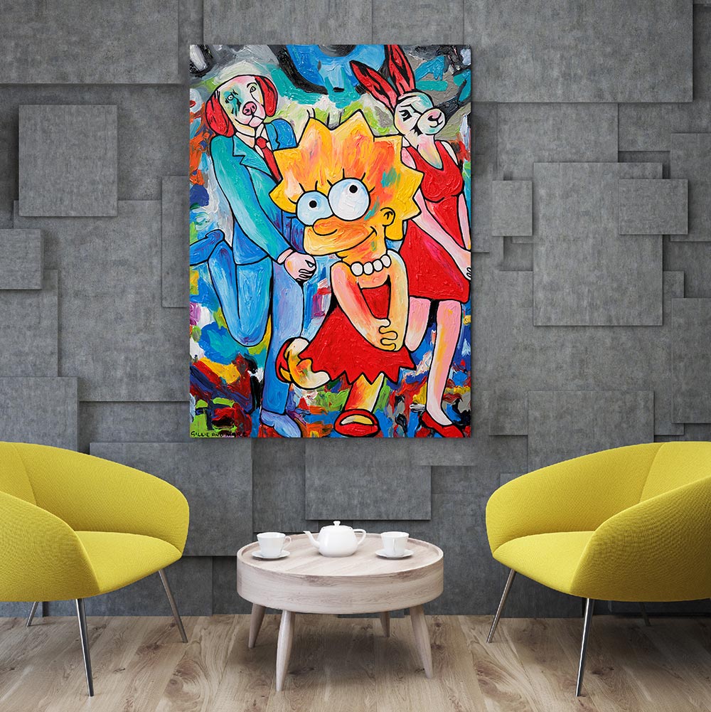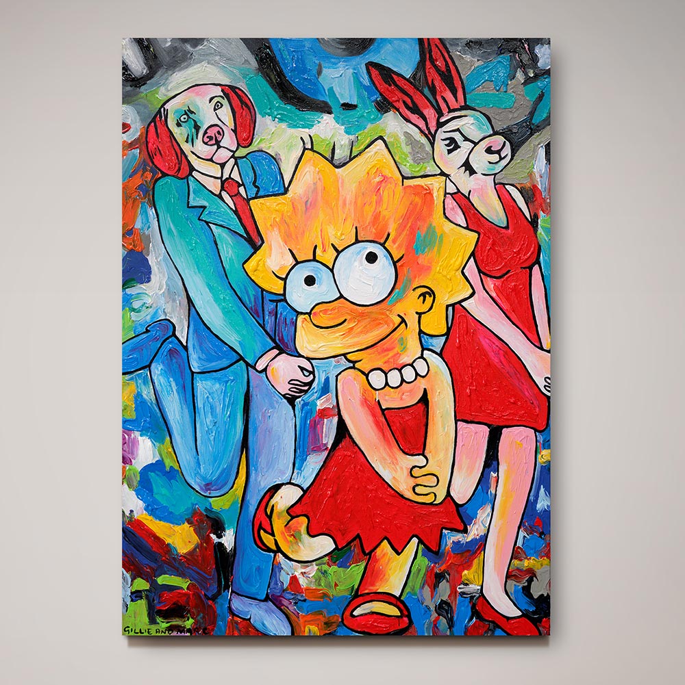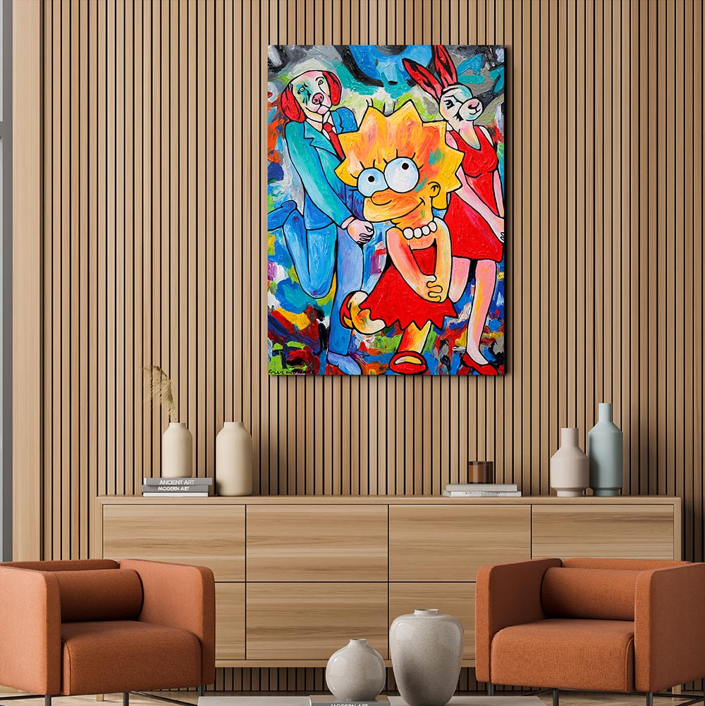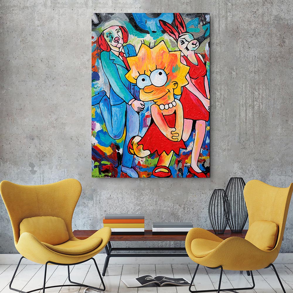 "Lisa Oh Lisa," a mesmerizing scene unfolds as Lisa takes center stage, gracefully dancing amidst a vibrant backdrop filled with the whimsical presence of Dogman and Rabbitwoman. Their figures, painted in lively hues, exude a sense of joy and camaraderie, adding depth to the kaleidoscope of colors that envelops the canvas. Against this lively tableau, Lisa's fluid movements seem to harmonize with the playful energy of her companions, creating a captivating spectacle that celebrates the boundless spirit of friendship and adventure.