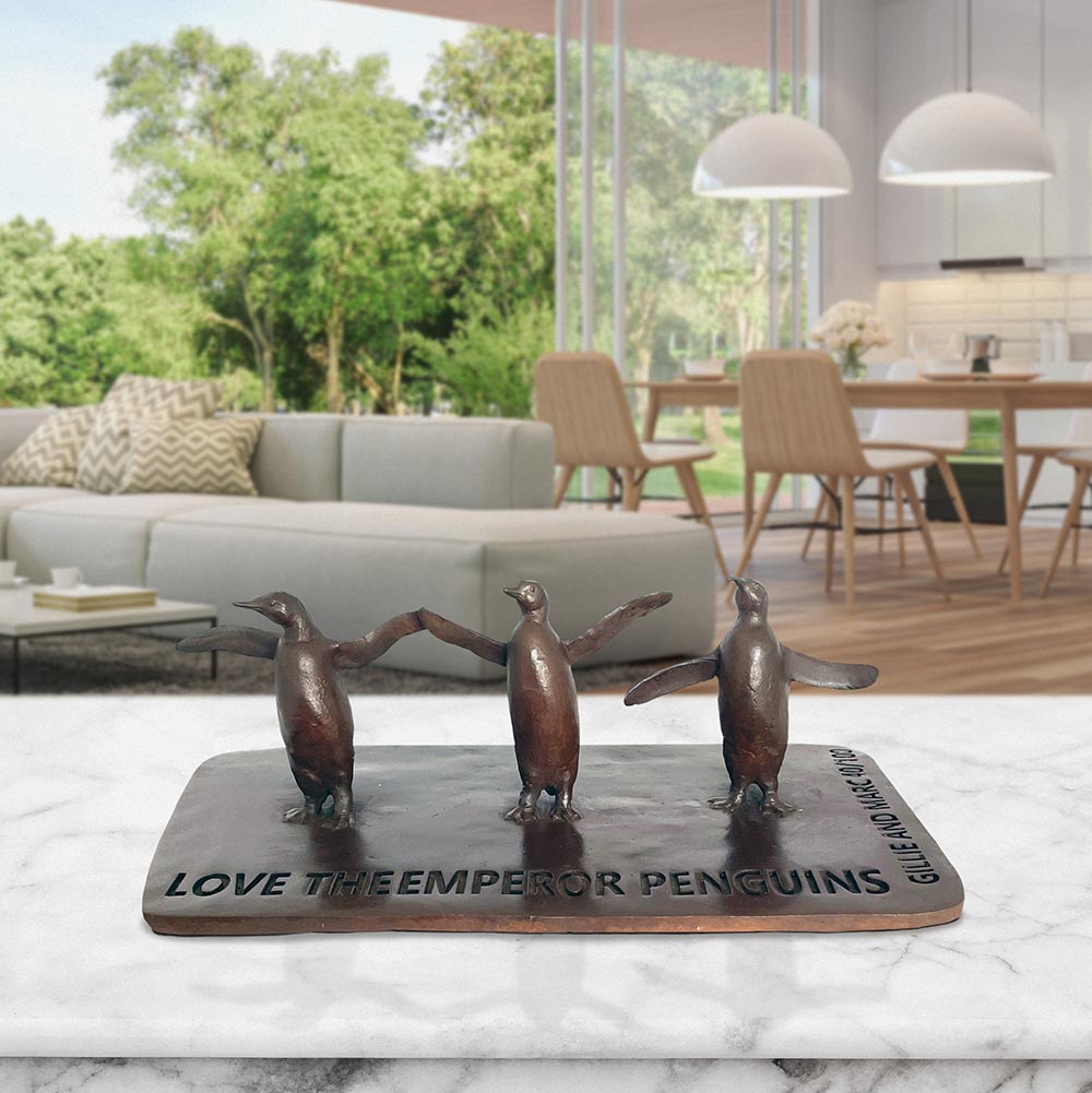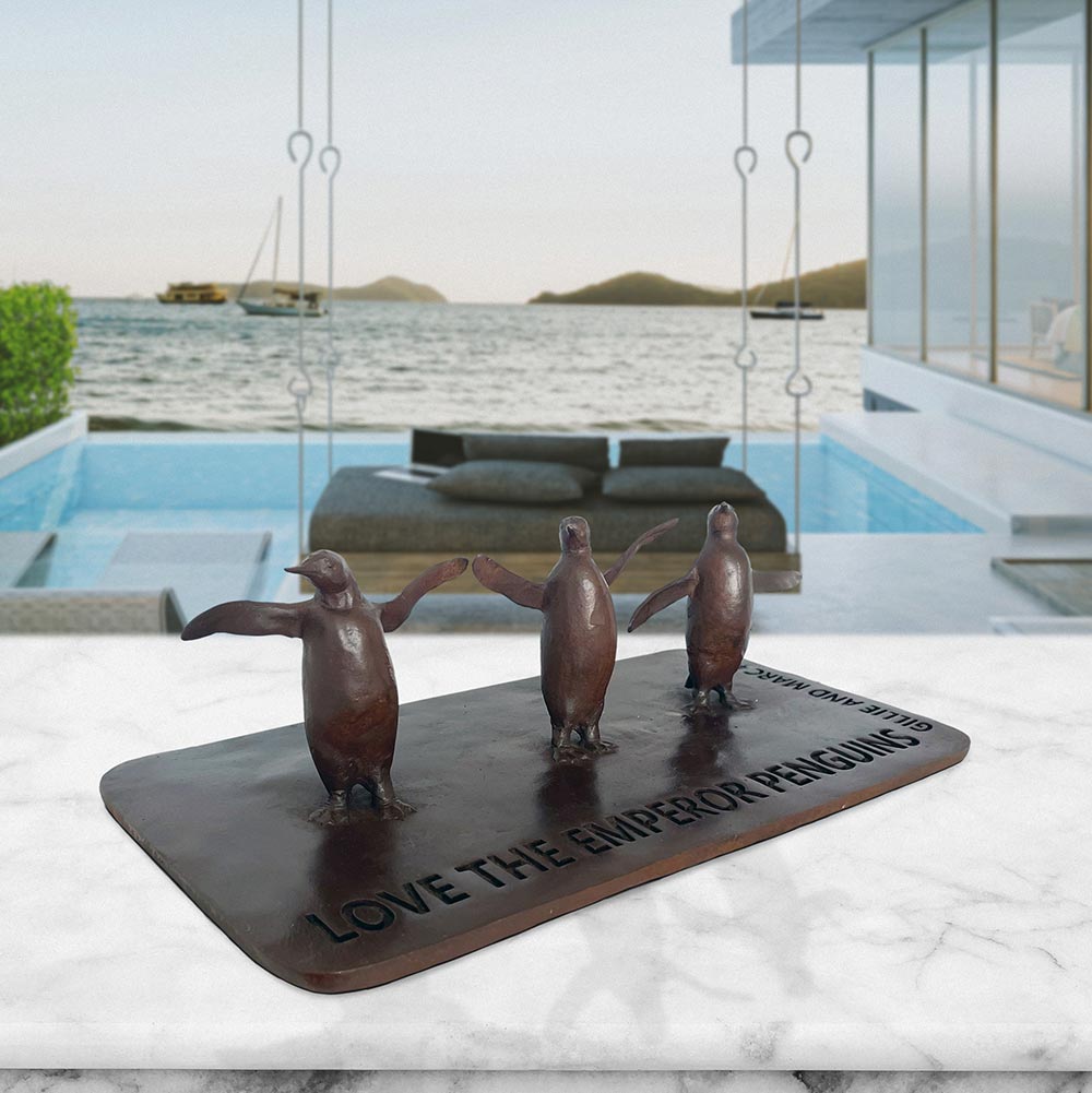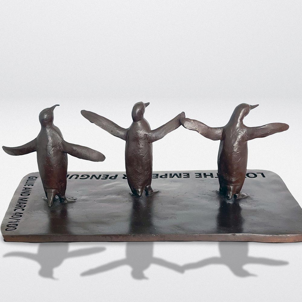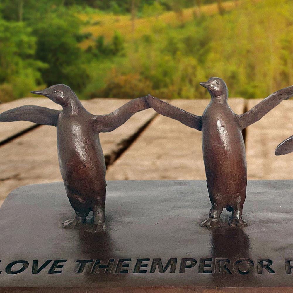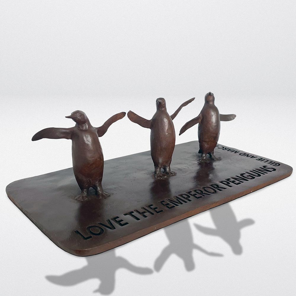 This is a mini replica of a group of Emperor Penguins in the monumental public sculpture Love The Last March. All the animals in the march are so very different yet they face the same threats. They march together in the hope that they will all be able to live with dignity.