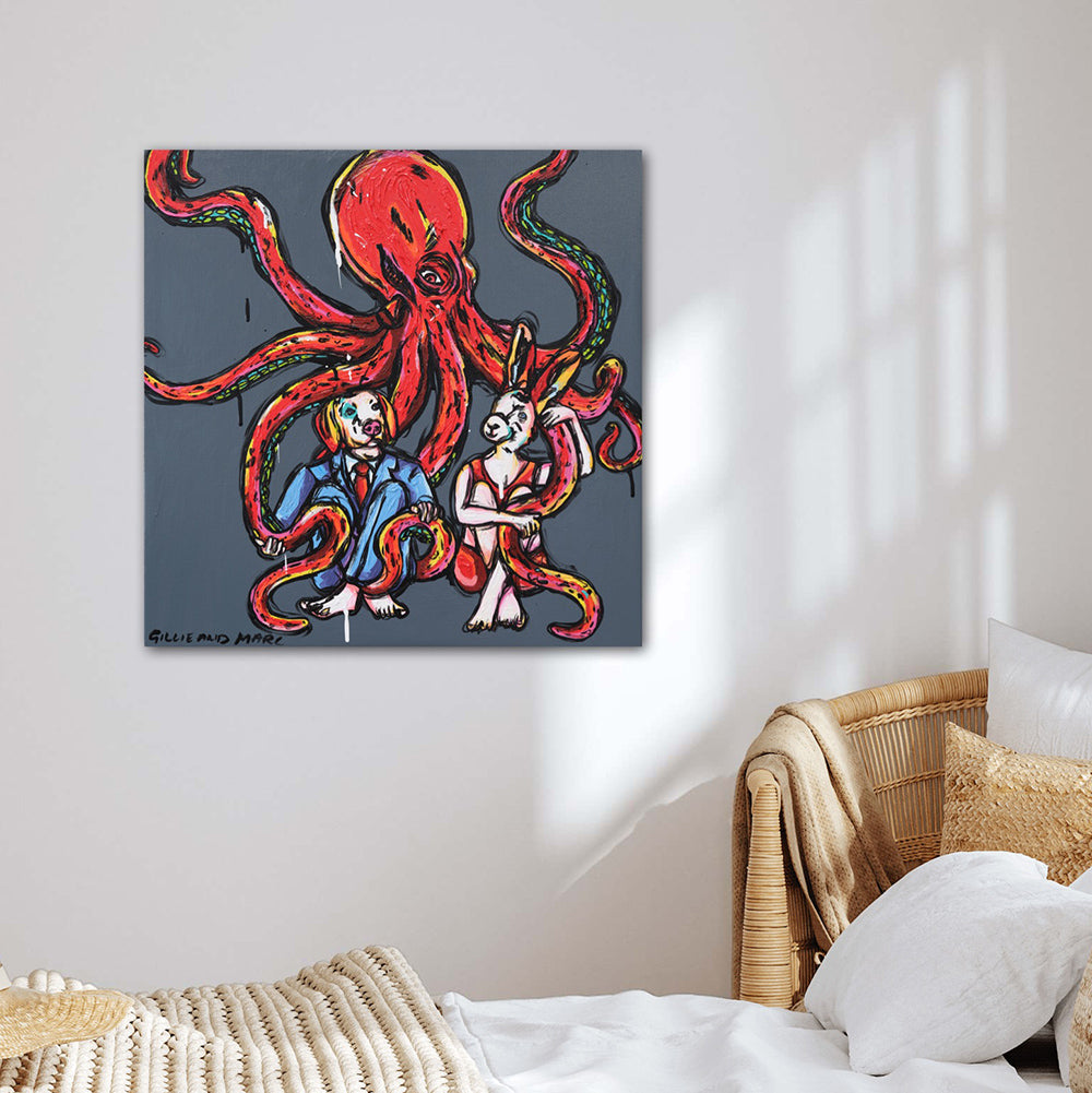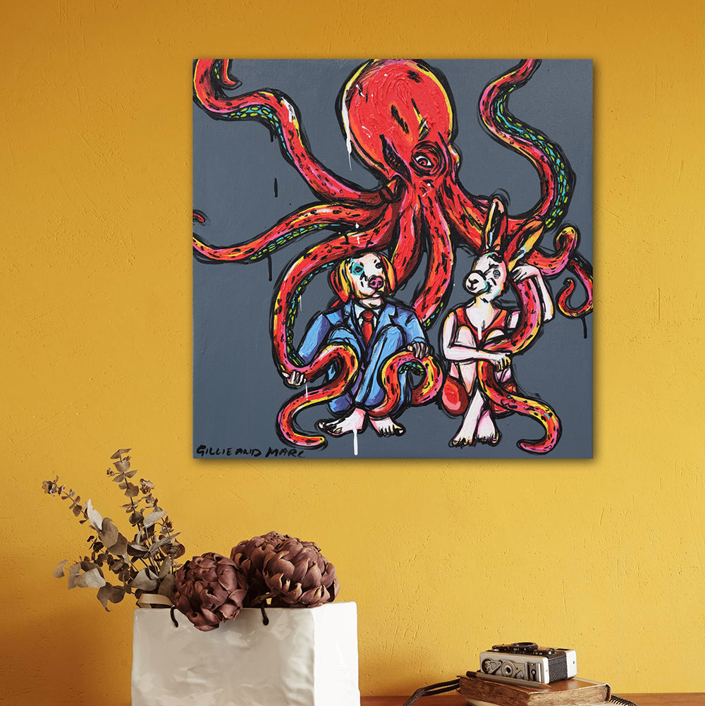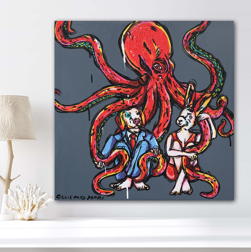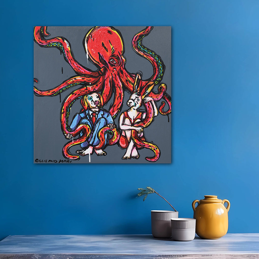 "Octopus Love" presents a captivating scene where Rabbitwoman and Dogman are tenderly embraced by a majestic red-billed octopus. Against an underwater backdrop, the octopus envelops the duo in its graceful arms, creating an intimate and mesmerizing tableau. The painting exudes a sense of tranquility and affection as Rabbitwoman and Dogman find solace in the gentle embrace of their unlikely companion. Through its ethereal imagery, the artwork invites viewers to contemplate the profound connections that transcend boundaries and species, highlighting the beauty of love in its most unexpected forms.