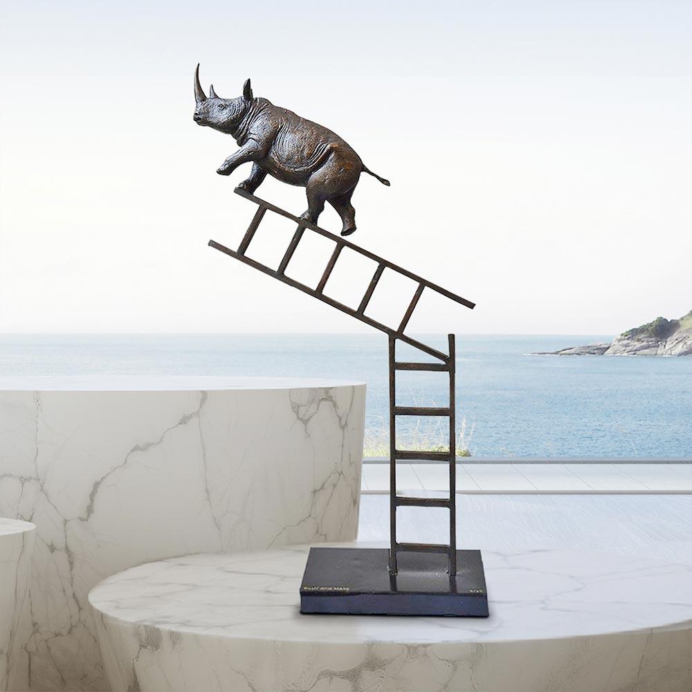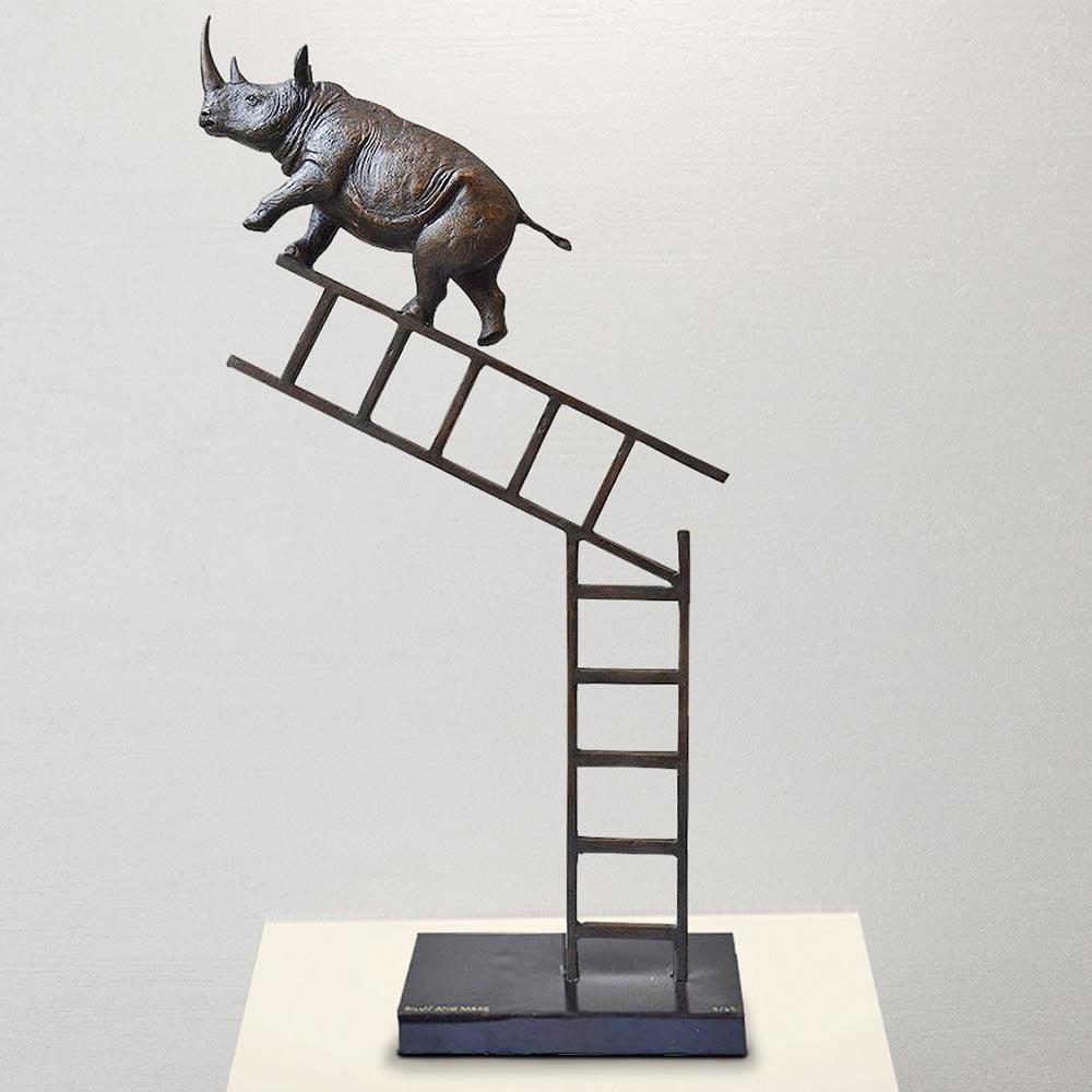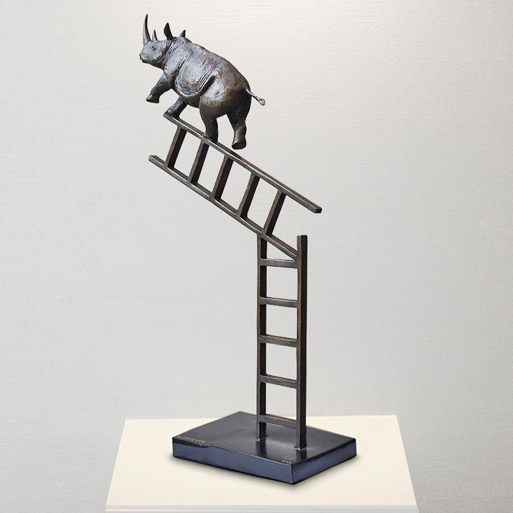 This rhino is on his way to the top! Things had hit rock bottom. His home was taken over by humans and he was constantly looking over his shoulder for fear a poacher could be hiding in the bushes, waiting to take his precious horn away. He decided enough was enough, he was no longer going to live in fear. With a little help from his friends, the rhino found a way out. Climbing high above the destruction below the rhino began his upward journey. From here it was up, up and away and he couldn’t wait to see what his new life had in store for him.