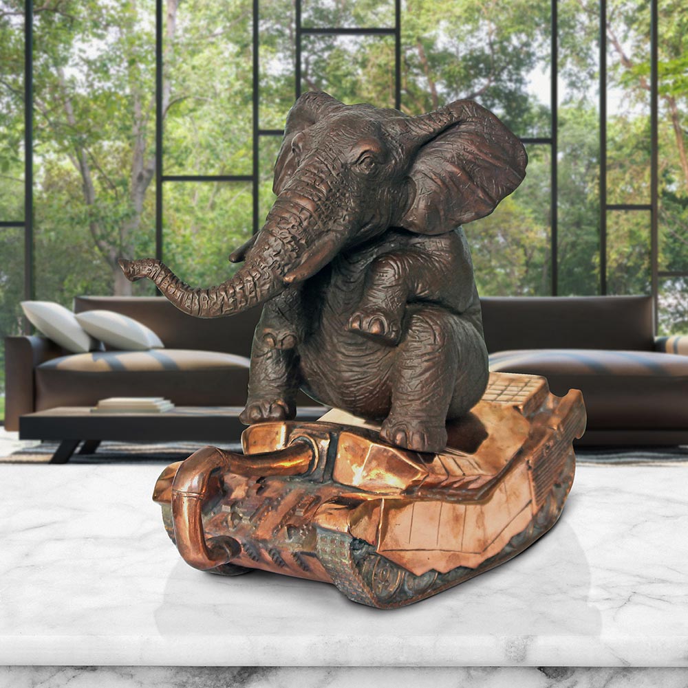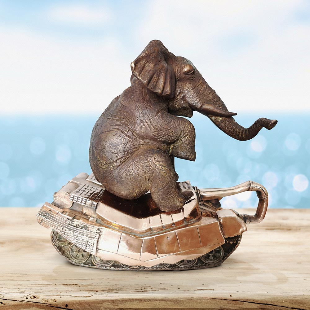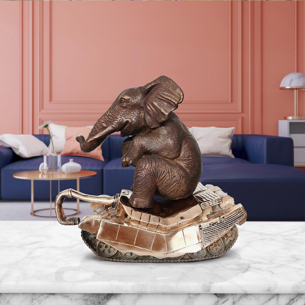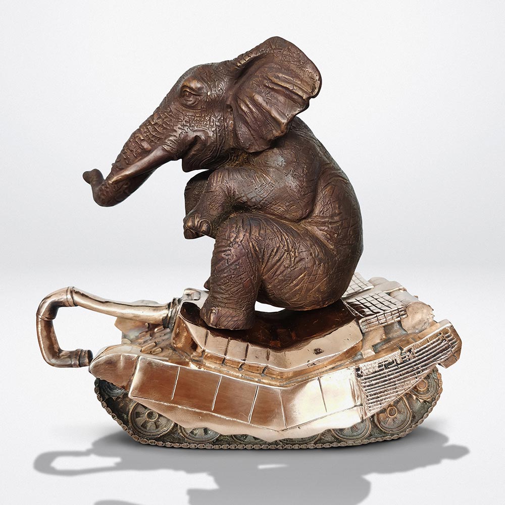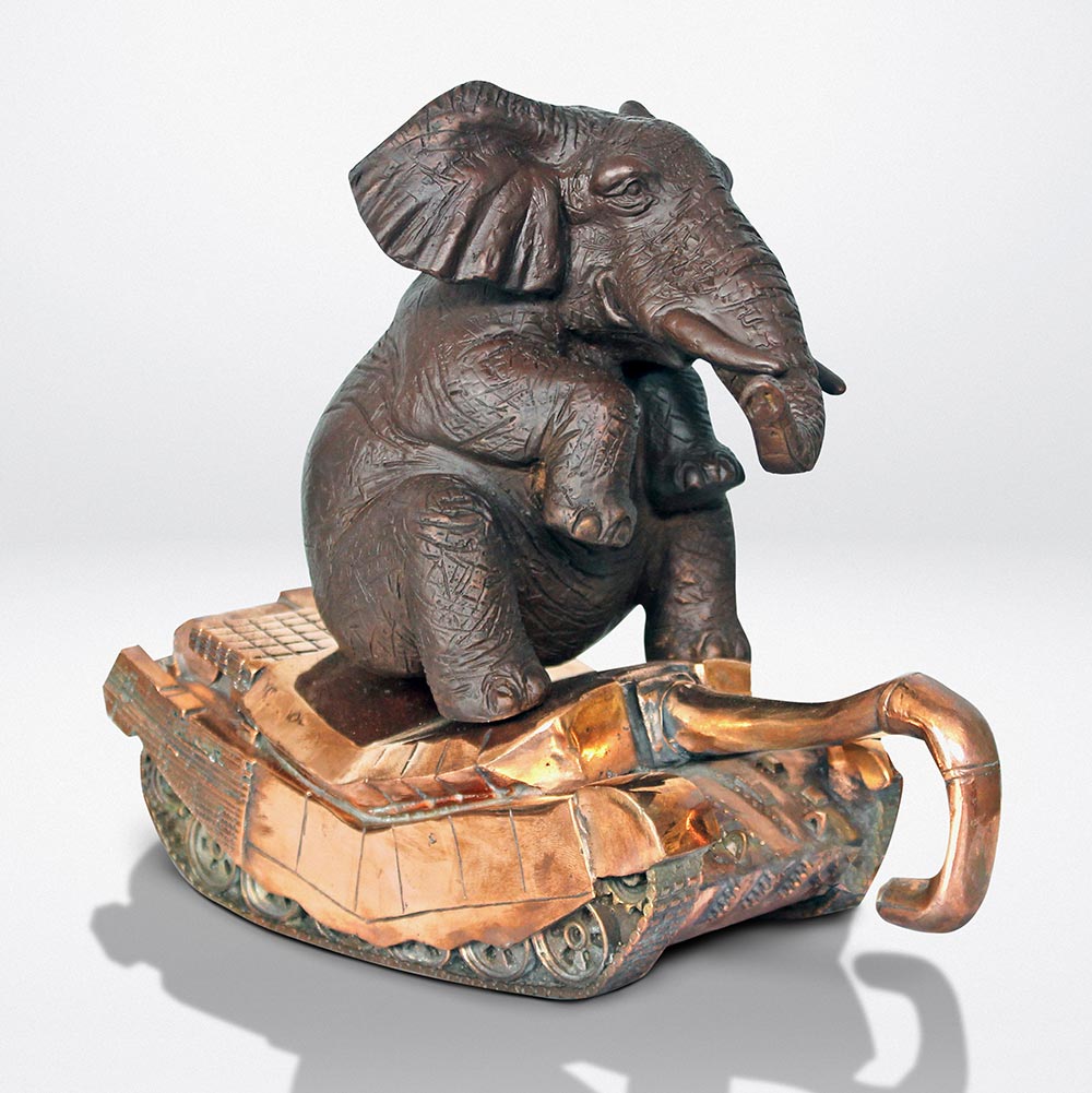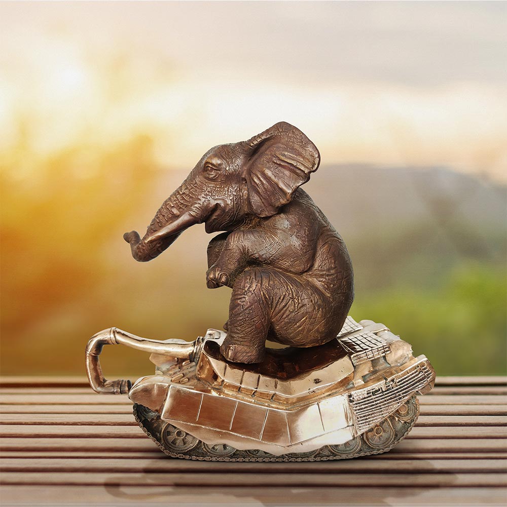 This sculpture features a big tank. But here to save the day is a beautiful great elephant, crushing the tank to useless metal and leaving the world a little bit safer.