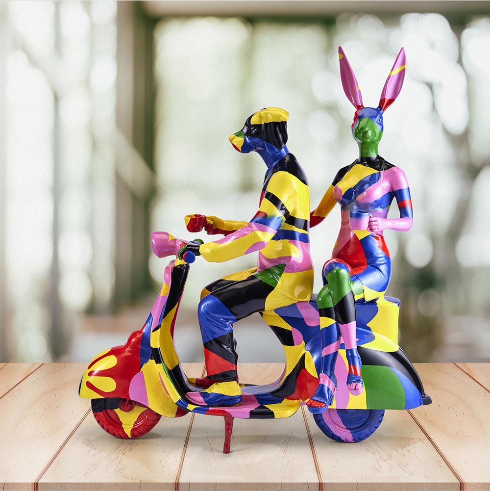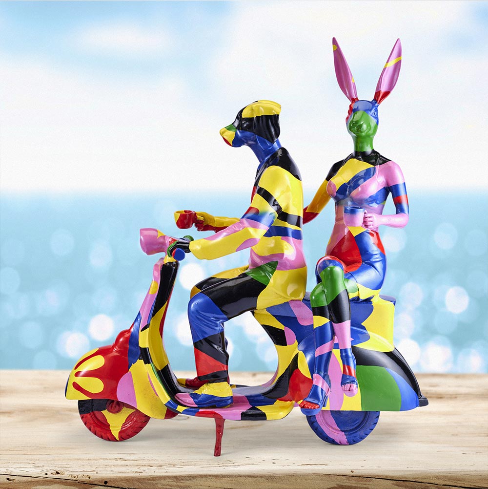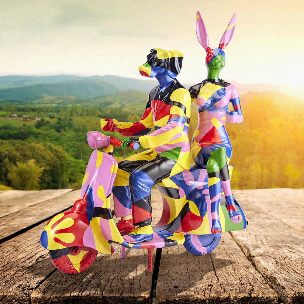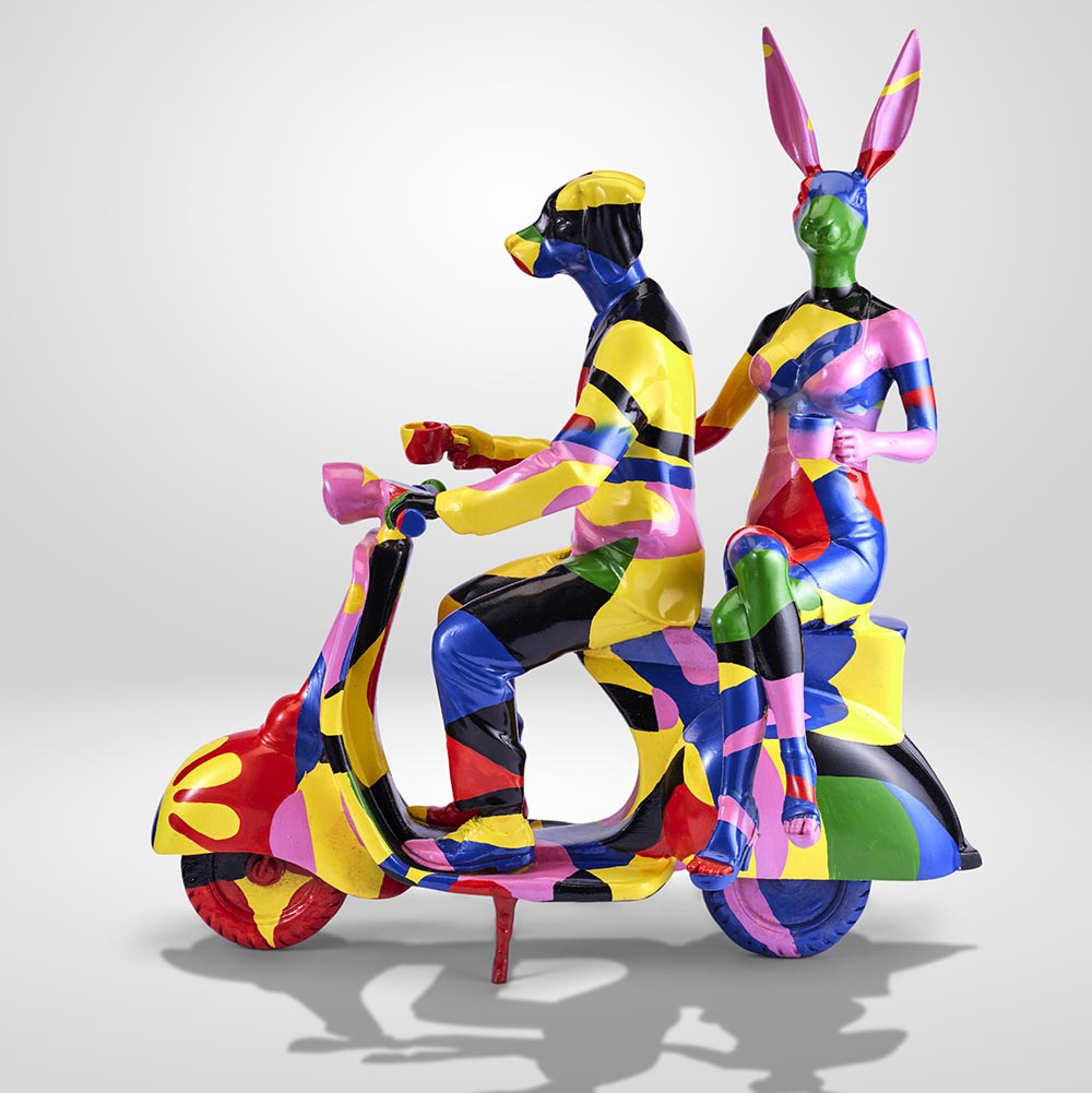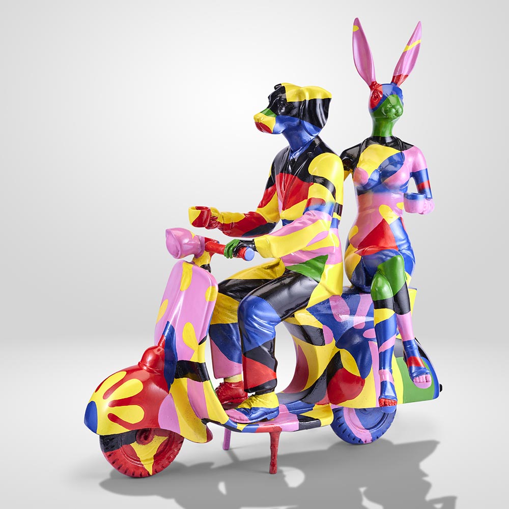 One of Gillie and Marc's most iconic sculptures. Ride away with Rabbitwoman and Dogman to a world without judgement, featuring their favourite mode of transportation! The Vespa reminds you that to not worry so much about the destination, because life is about enjoying the ride!