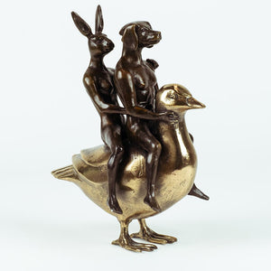 Gillie and Marc’s hybrid characters, Dogman and Rabbitwoman, represent the ultimate odd couple – two individuals who love each other even though they don’t fit in to the outside world’s expectations. They tell the artists’ own true love story and reflect their belief in embracing the diversity of relationship experiences. Ducks develop strong bonds with their mates with some species sticking together as a pair for numerous years. Gillie and Marc also see their own children, Jessie and Ben, as their best friends. Like them, a mother duck is also very caring towards their young, which is why Dogman and Rabbitwoman like them so much.