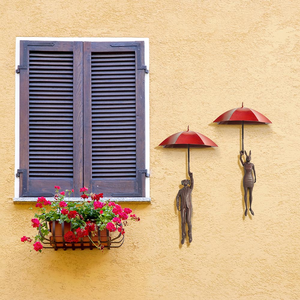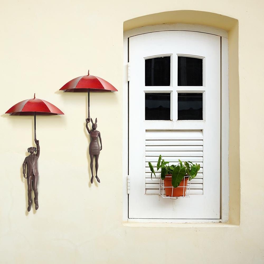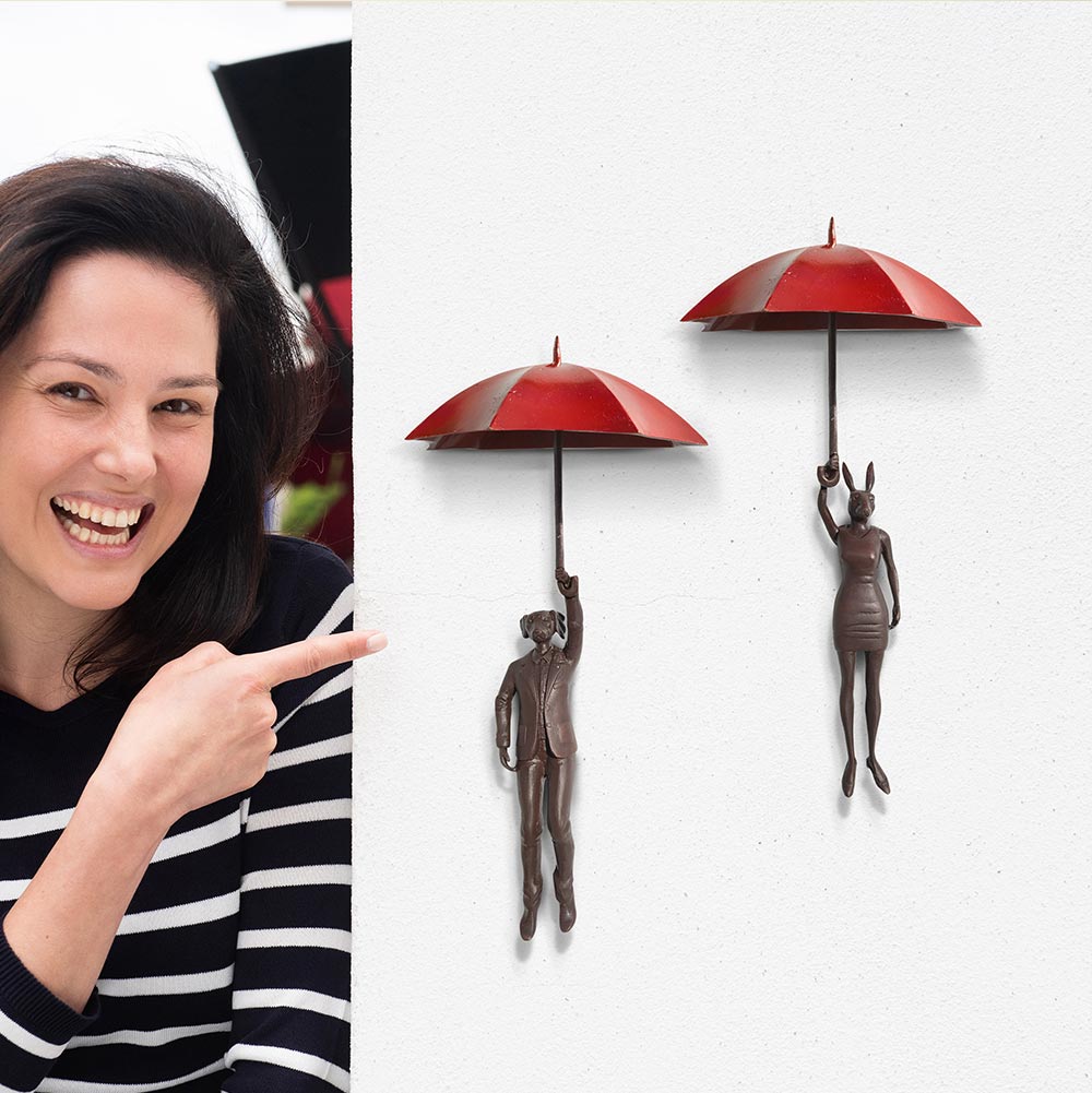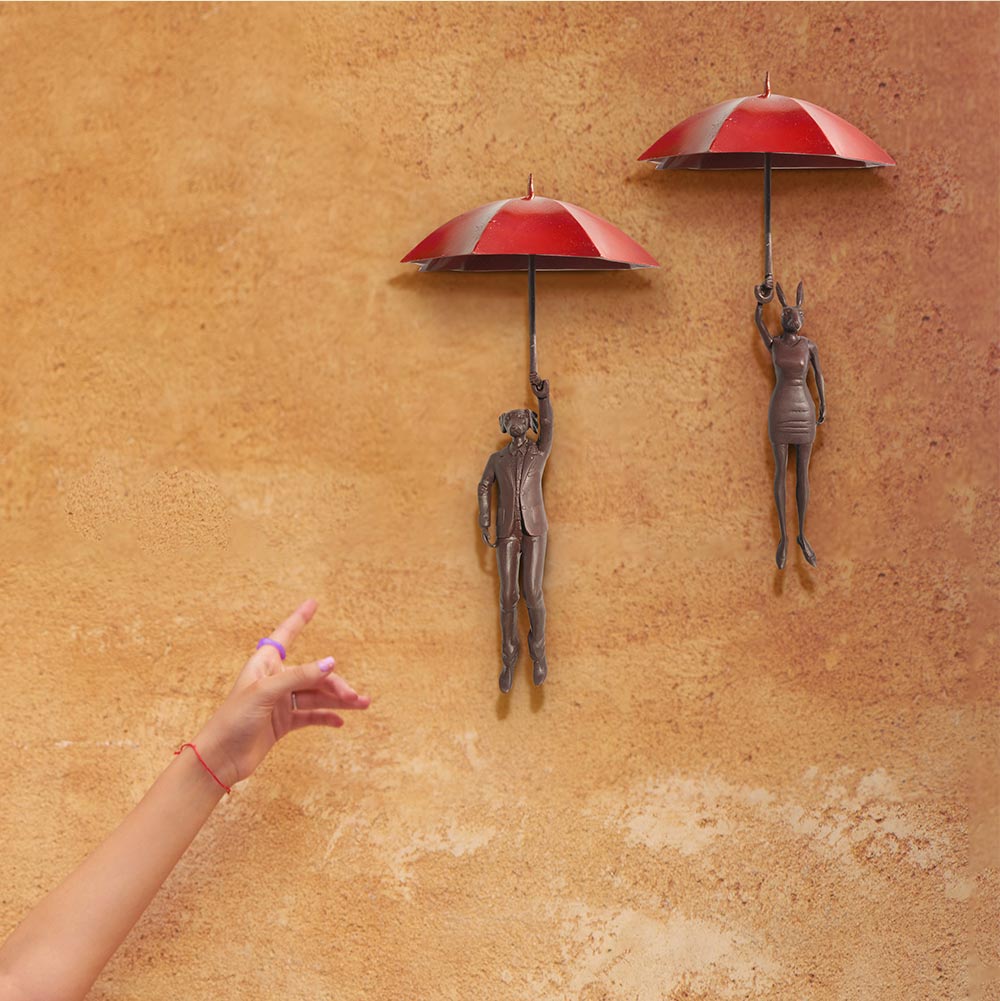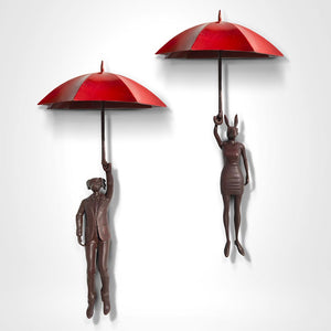 This whimsical wall-hanging sculpture captures the fantastical journey of Dogman and Rabbitwoman as they soar through the sky, each gripping a vibrant red umbrella. The duo defies gravity, their bodies tilted in dynamic, playful poses that suggest an upward, wind-driven lift. Dogman, with his ears flapping exudes steadfast courage, while Rabbit Woman’s lithe radiates elegance and curiosity.
