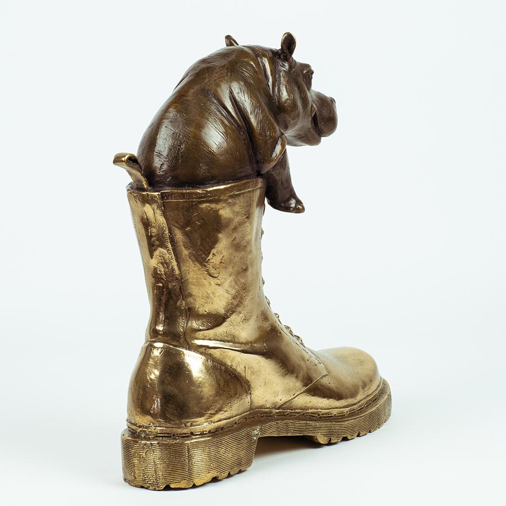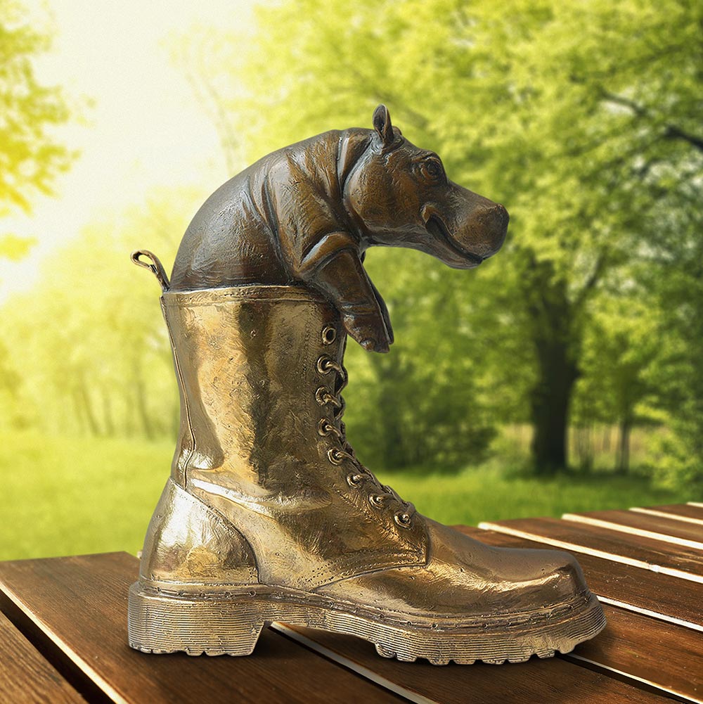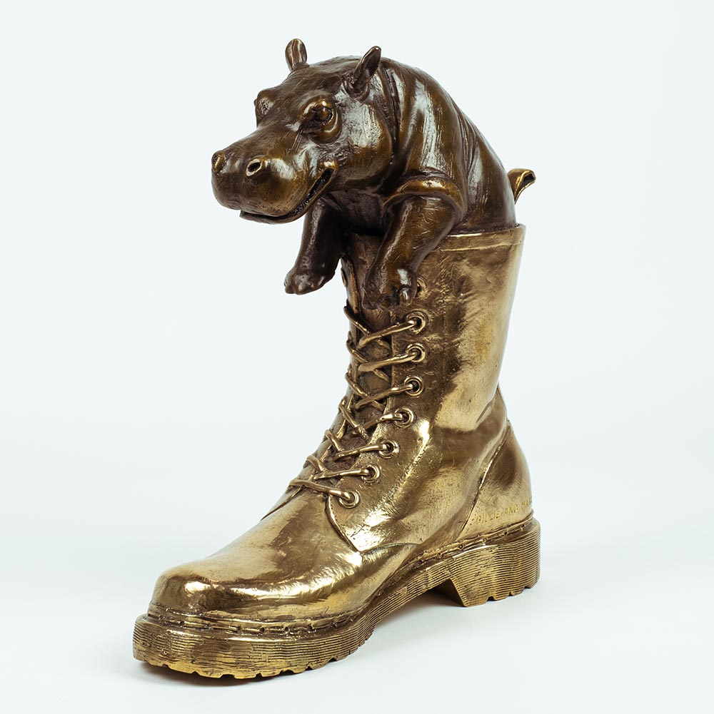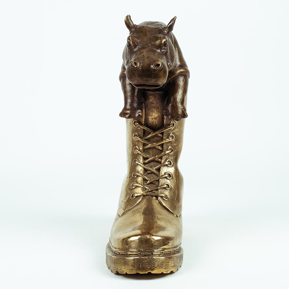 Peeping out of the top of a Dr Martens this baby hippo is looking to see who is willing to walk with her. One of the most popular shoe brands in the world, worn by musicians, anarchists, and anyone fashion-forward, this little hippo is hoping to help people from all walks of life know what it’s like to walk in a hippo’s shoes. She hopes they will understand the problems of habitat loss, poaching, and climate change her kind are facing and help her away from the threat of extinction.