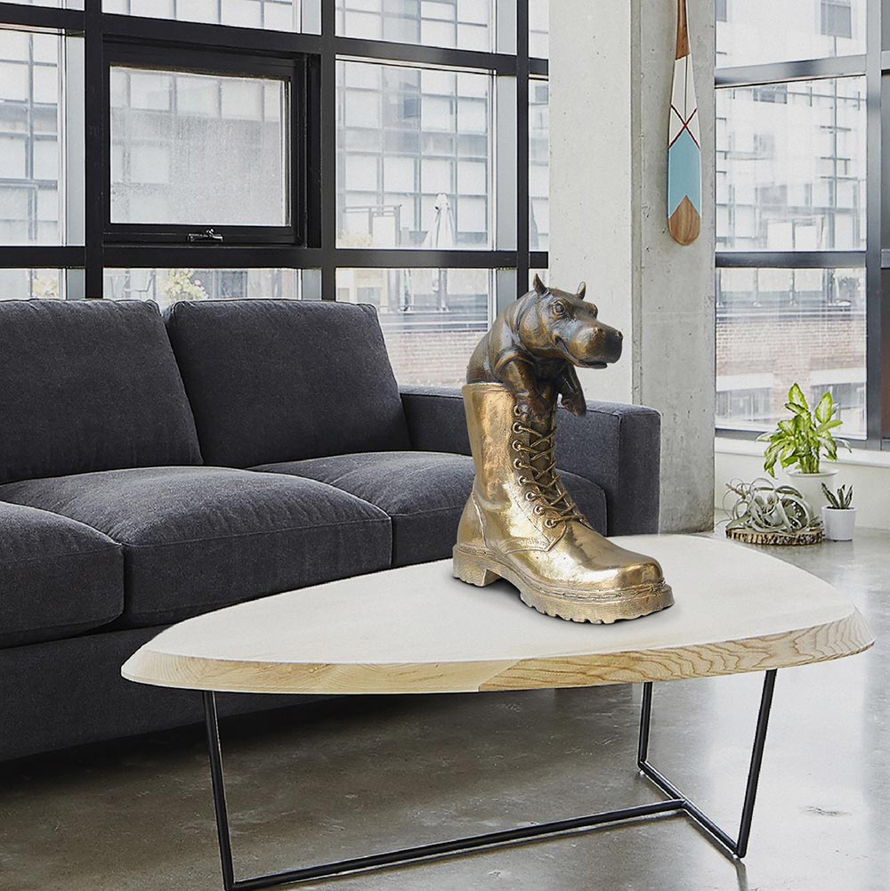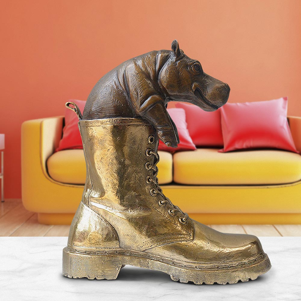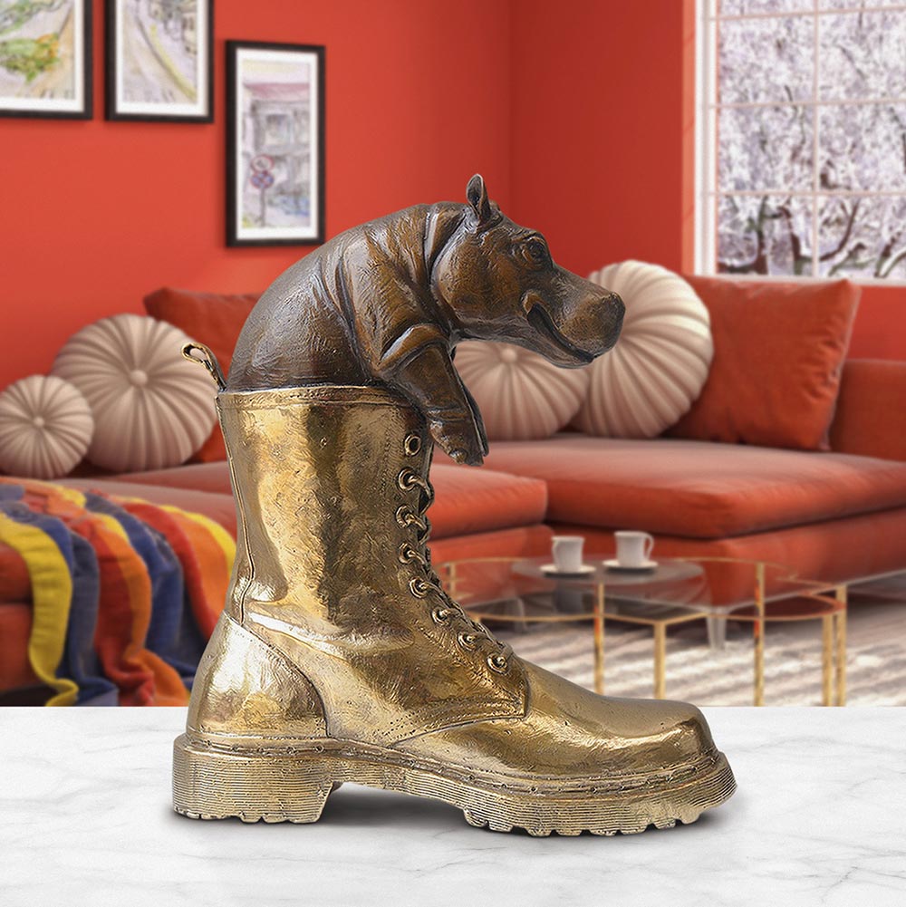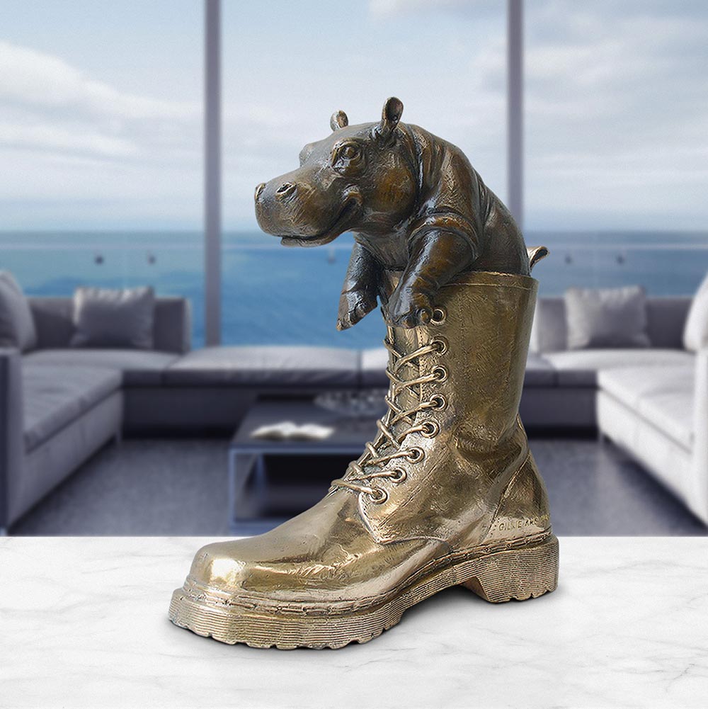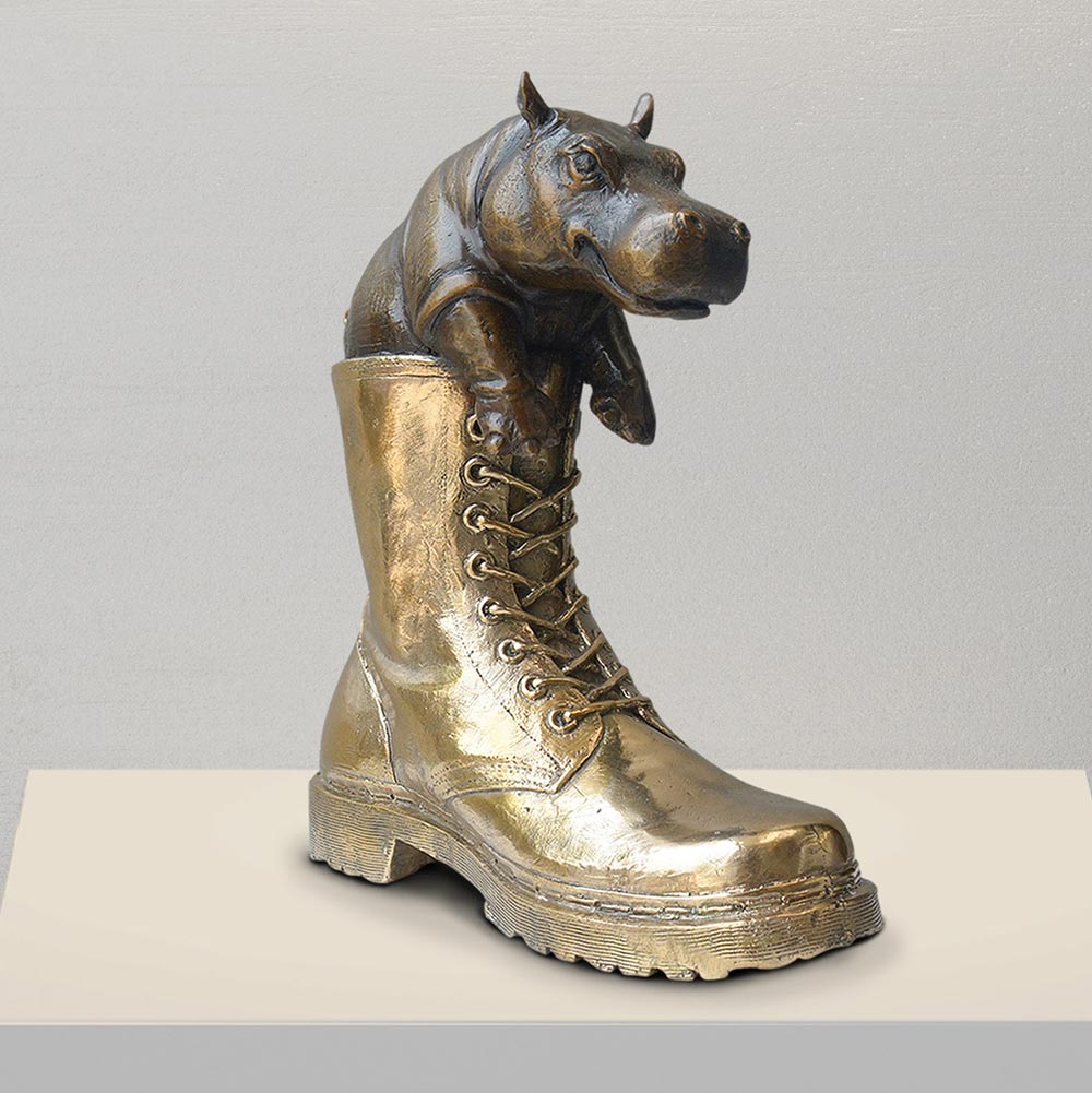 Peeping out of the top of a Dr Martens this baby hippo is looking to see who is willing to walk with her. One of the most popular shoe brands in the world, worn by musicians, anarchists, and anyone fashion-forward, this little hippo is hoping to help people from all walks of life know what it’s like to walk in a hippo’s shoes. She hopes they will understand the problems of habitat loss, poaching, and climate change her kind are facing and help her away from the threat of extinction.