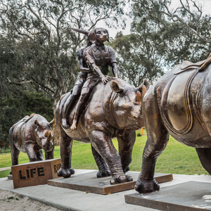 The sculpture was donated to La Trobe University in Melbourne in the name of bringing art to the people. “The Run for your Life sculptures are a welcome and striking addition to our Melbourne campus and appreciated by staff and students,” said Chancellor Professor Adrienne E Clarke. “Our family of rhinoceros are prompting discussion, delight and curiosity – traits encouraged by our University.”